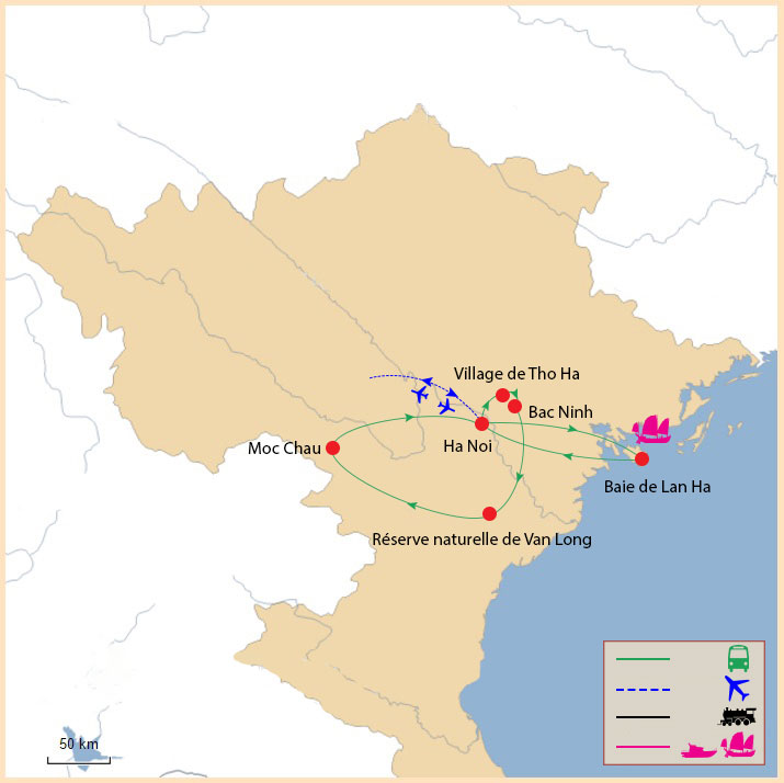 L’itinéraire traverse plusieurs régions authentiques comme les villages artisanaux de Tho Ha, les temples historiques de Bac Ninh, les paysages sauvages de la réserve naturelle de Van Long, les plantations de thé du plateau de Moc Chau, et la splendide baie de Lan Ha.