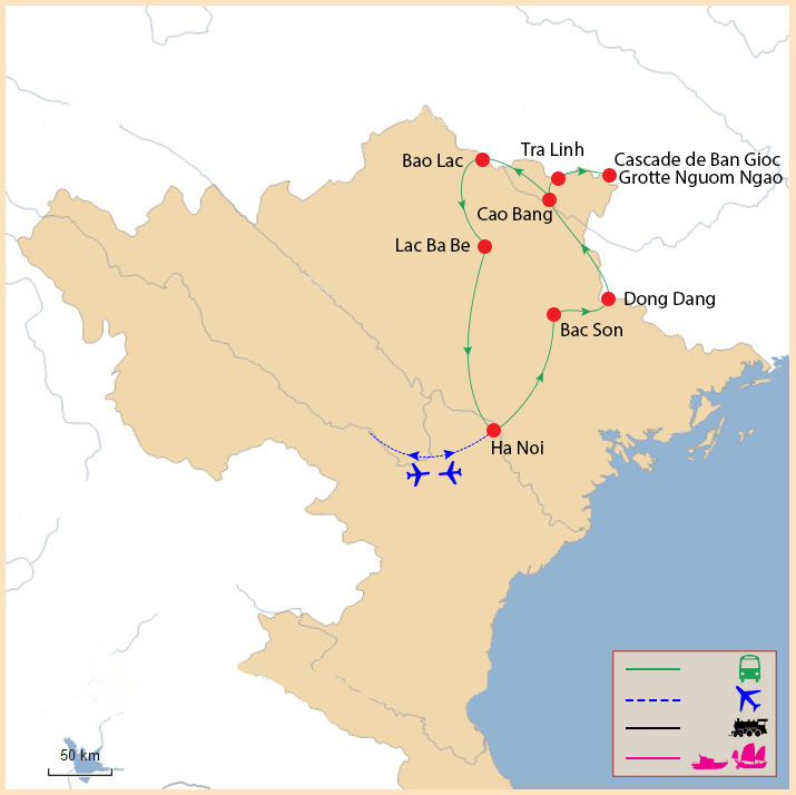 Les voyageurs découvrent également des paysages naturels impressionnants comme la cascade de Ban Gioc et le lac Ba Be, tout en rencontrant différentes communautés ethniques vivant dans les montagnes du nord-est vietnamien.