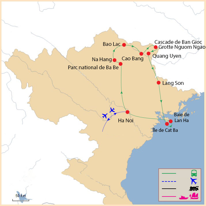 Tout au long du voyage, les voyageurs rencontrent différentes minorités ethniques – Tay, Nung, Dao et Hmong – dont les traditions restent très vivantes. Le circuit se termine par un séjour relaxant sur l’île de Cat Ba et une croisière dans la magnifique baie de Lan Ha, l’une des plus belles baies du Vietnam.