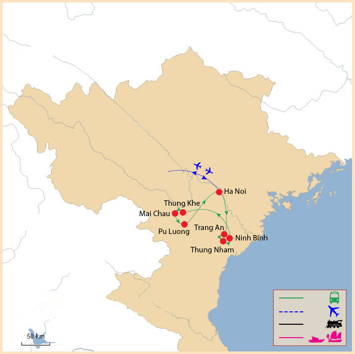 Au cours de ce circuit, les voyageurs explorent les grottes naturelles de Trang An, les paysages sauvages de la vallée de Thung Nham, traversent le spectaculaire col de Thung Khe et découvrent les villages Thai situés dans la vallée de Mai Chau.