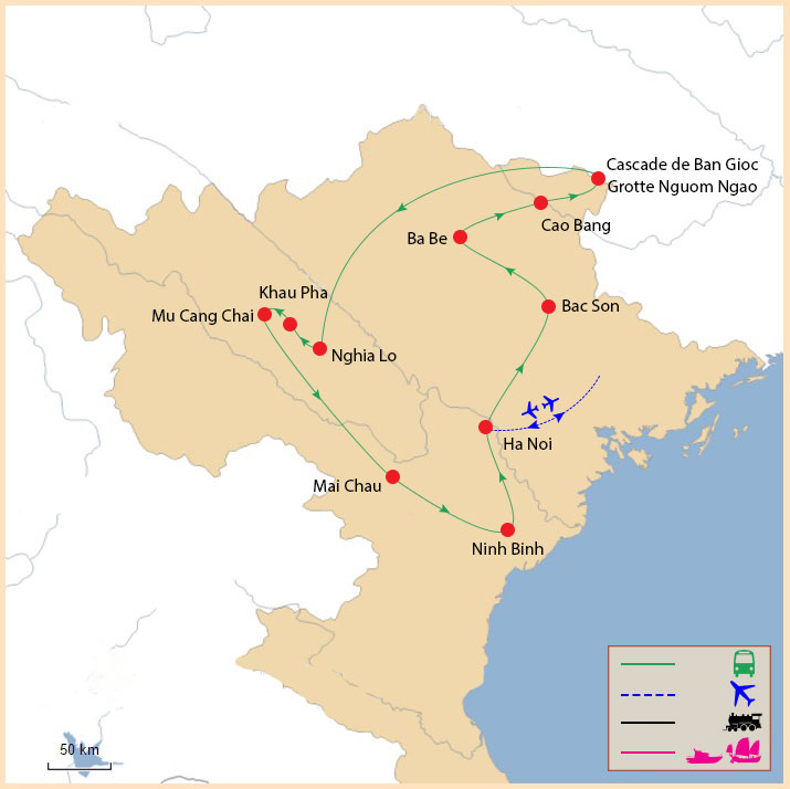 Au cours de ce voyage, les voyageurs explorent la vallée spectaculaire de Bac Son, naviguent sur le paisible lac Ba Be, découvrent les paysages karstiques de Cao Bang et la majestueuse cascade de Ban Gioc, avant de rejoindre les rizières de Nghia Lo et Mu Cang Chai.